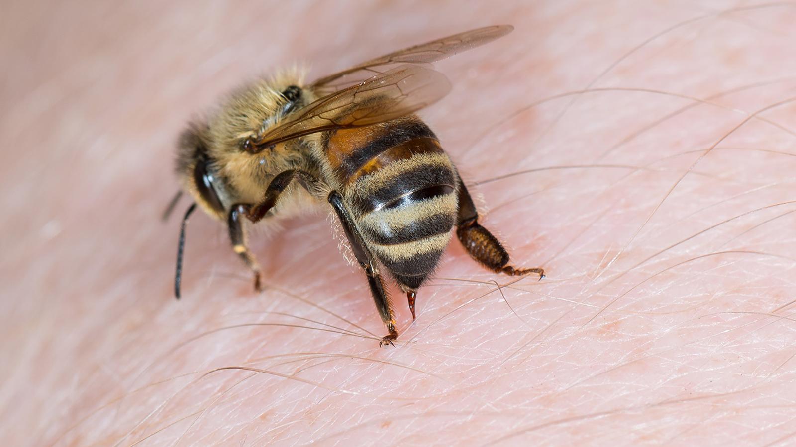 Prinzipiell noch wesentlich gefährlicher als die Wespe ist die Honigbiene. Sie verfügt über einen Wehrstachel, den sie nur benutzt, wenn sie in Bedrängnis gerät. Außerhalb ihres Nestes ist die Biene nicht aggressiv. Doch sticht sie zu, bleibt der Stachel mitsamt der Giftblase hängen und kann auch nach dem Stich noch Gift einspritzen. Die abgegebene Giftmenge ist dabei in etwa zehn Mal mehr als bei einem Wespenstich. Nach einem Bienenstich ist es wichtig, den Stachel möglichst rasch zu entfernen.